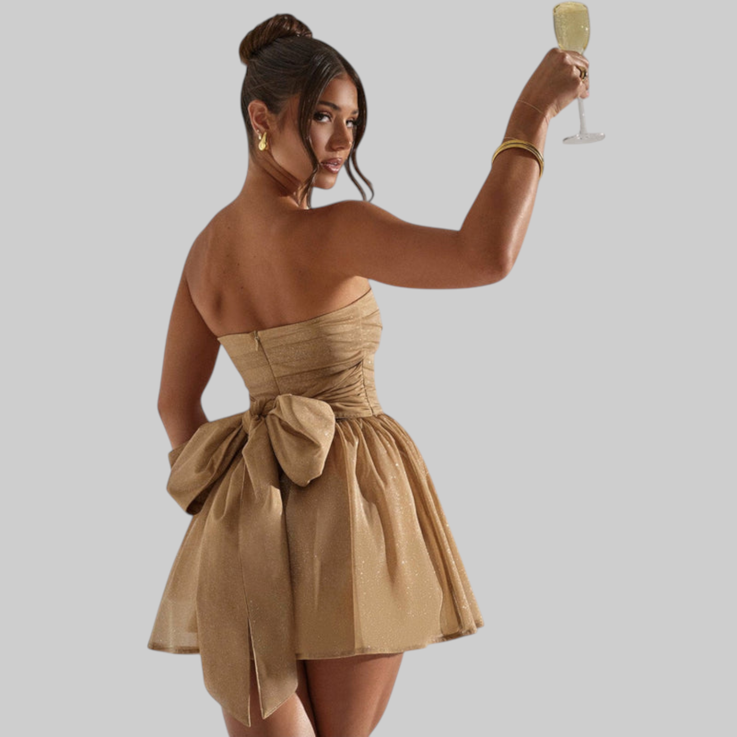 El vestido mini Gisella destaca con su diseño sin hombros y su silueta ajustada. Ideal para noches especiales, fiestas o citas, este vestido garantiza un look glamuroso con un toque de extravagancia.