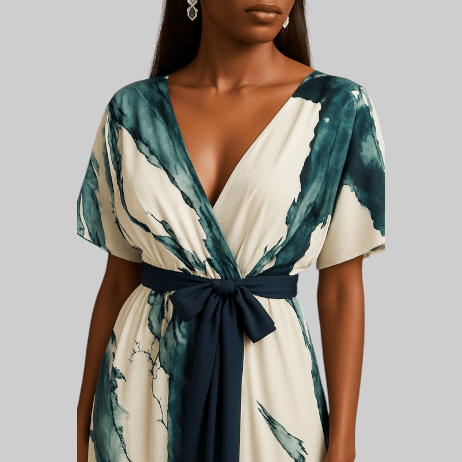 ✔ Corte favorecedor: Escote en V y cinturón anudado para realzar la silueta