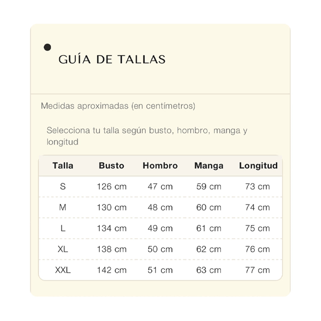 Las medidas pueden variar ligeramente (1–3 cm) según el corte y el tejido.